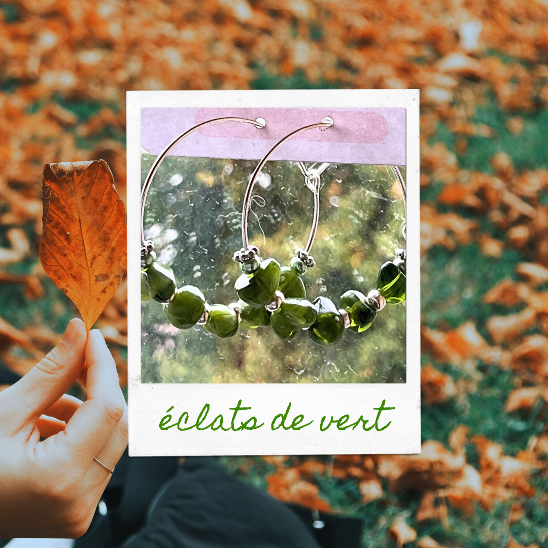 Je te présente donc les boucles d’oreilles « Éclats de… » ; éclats de douceur, éclats de nature, éclats de couleurs, éclats de pierres. Les perles « pierres » sont en résine, ce ne sont pas de vraies pierres, elles sont largement arrondies et elles sont aussi douces au toucher.