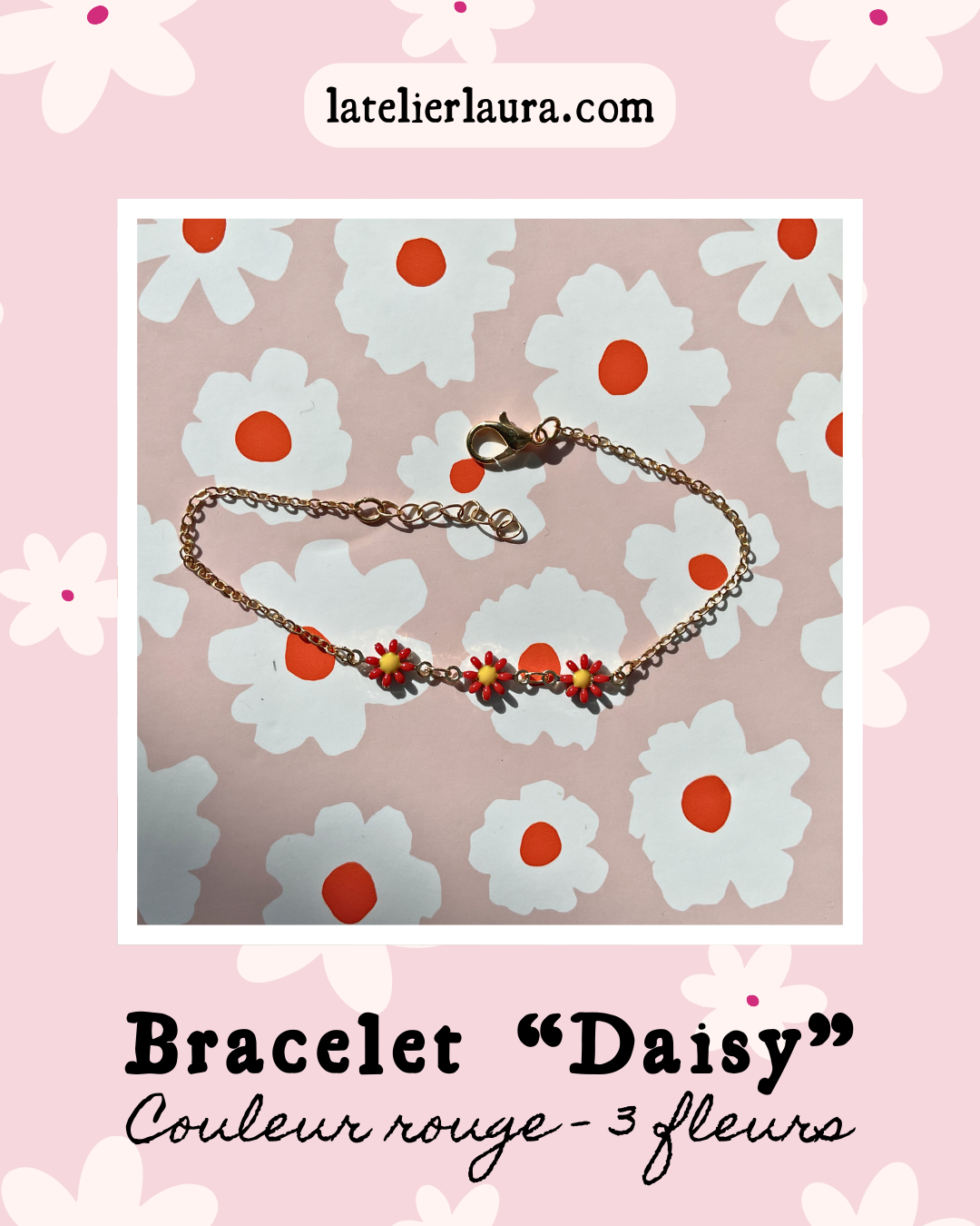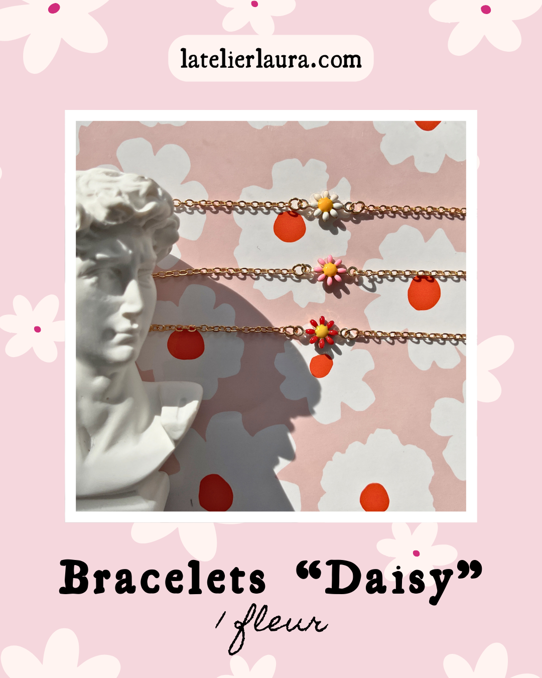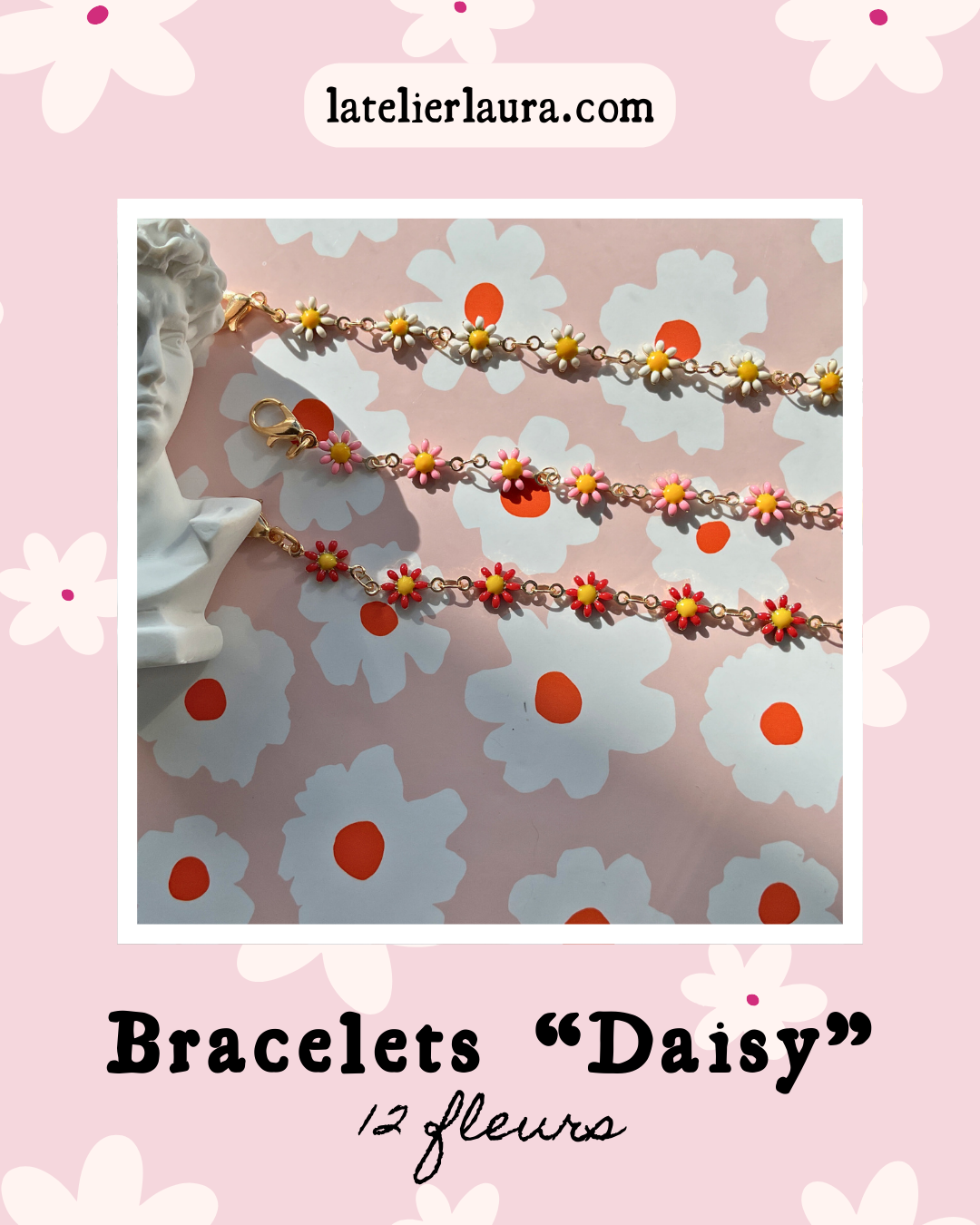 bracelets printemps ; bracelet en chaîne ; bracelets à fleurs ; fleur rouge ; fleur blanche ; fleur rose ; bracelets à offrir ; bracelets minimalistes ; bracelet personnalisable
