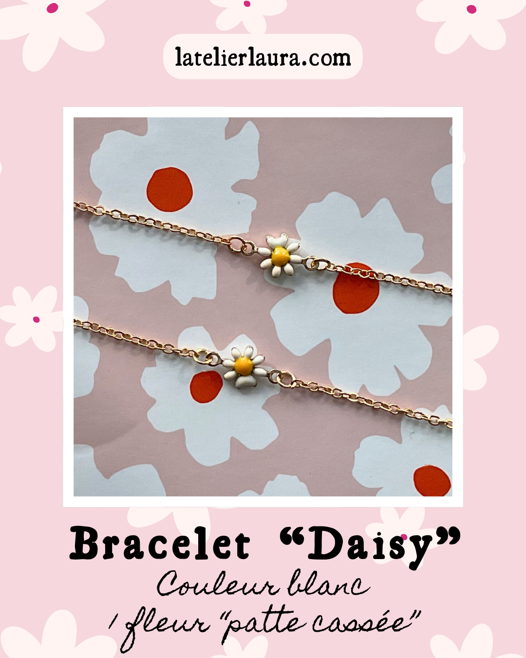Petite exclusivité : nous avons 2 bracelets à prix réduits, d’1 fleur blanche « patte cassée » où vous verrez 2 pétales collés (contrairement à toutes les autres fleurs où les pétales sont bien séparés…) Puisque les breloques restent mignonnes, même si imparfaites, nous avons décidé d’en faire des créations comme toutes les autres !