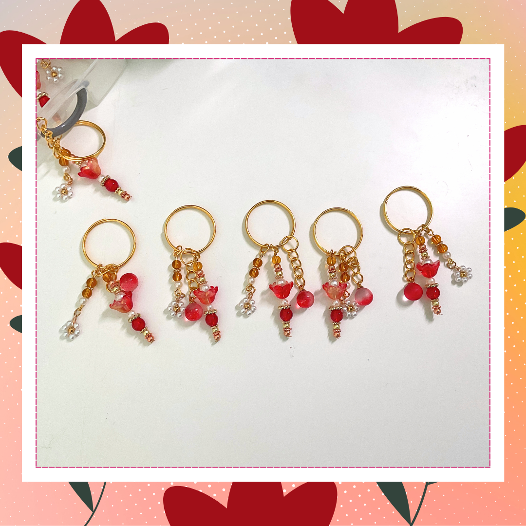 porte-clé fleur rouge, bijou artisanal, pierre naturelle ambre, cadeau élégant femme, porte-clé chic intemporel, accessoires fait main