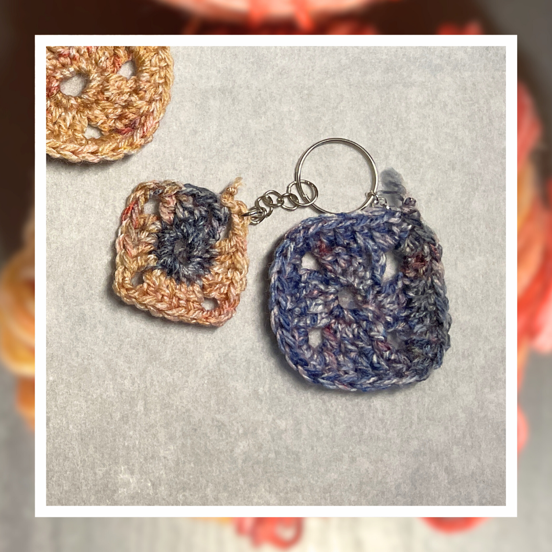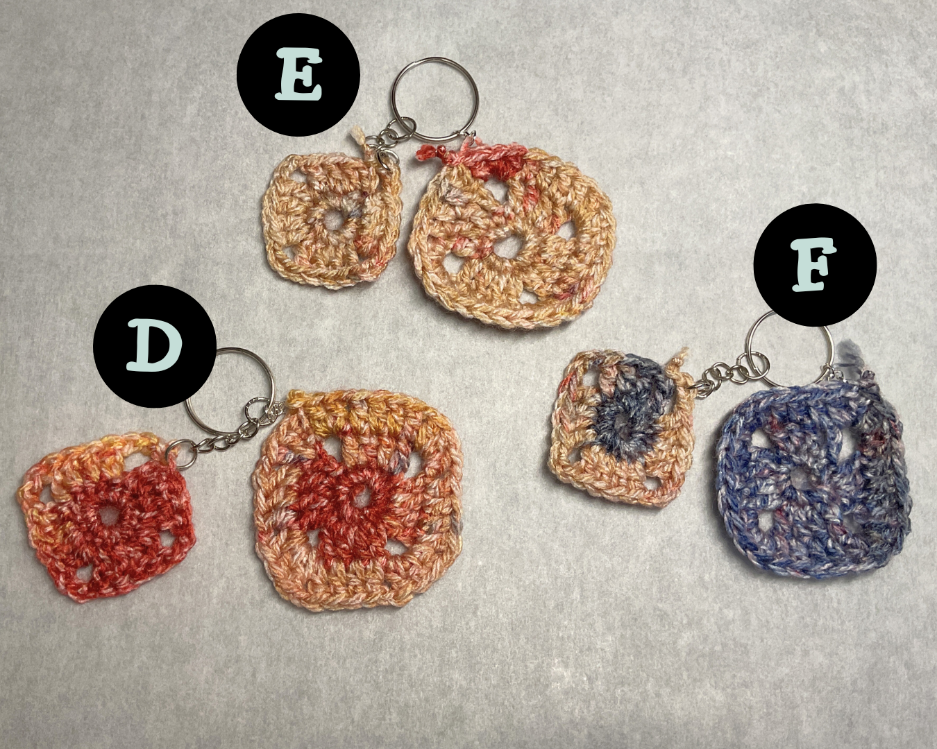 Tu trouveras en plus 2 formats pour les porte-clés : 3 petits granny squares ou bien 1 petit granny square + 1 grand granny square !